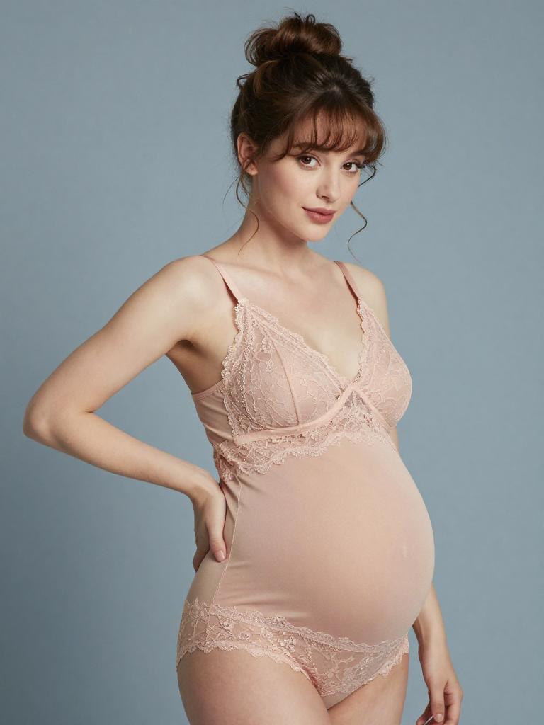 Pregnant Woman in Nude Lace Maternity Lingerie