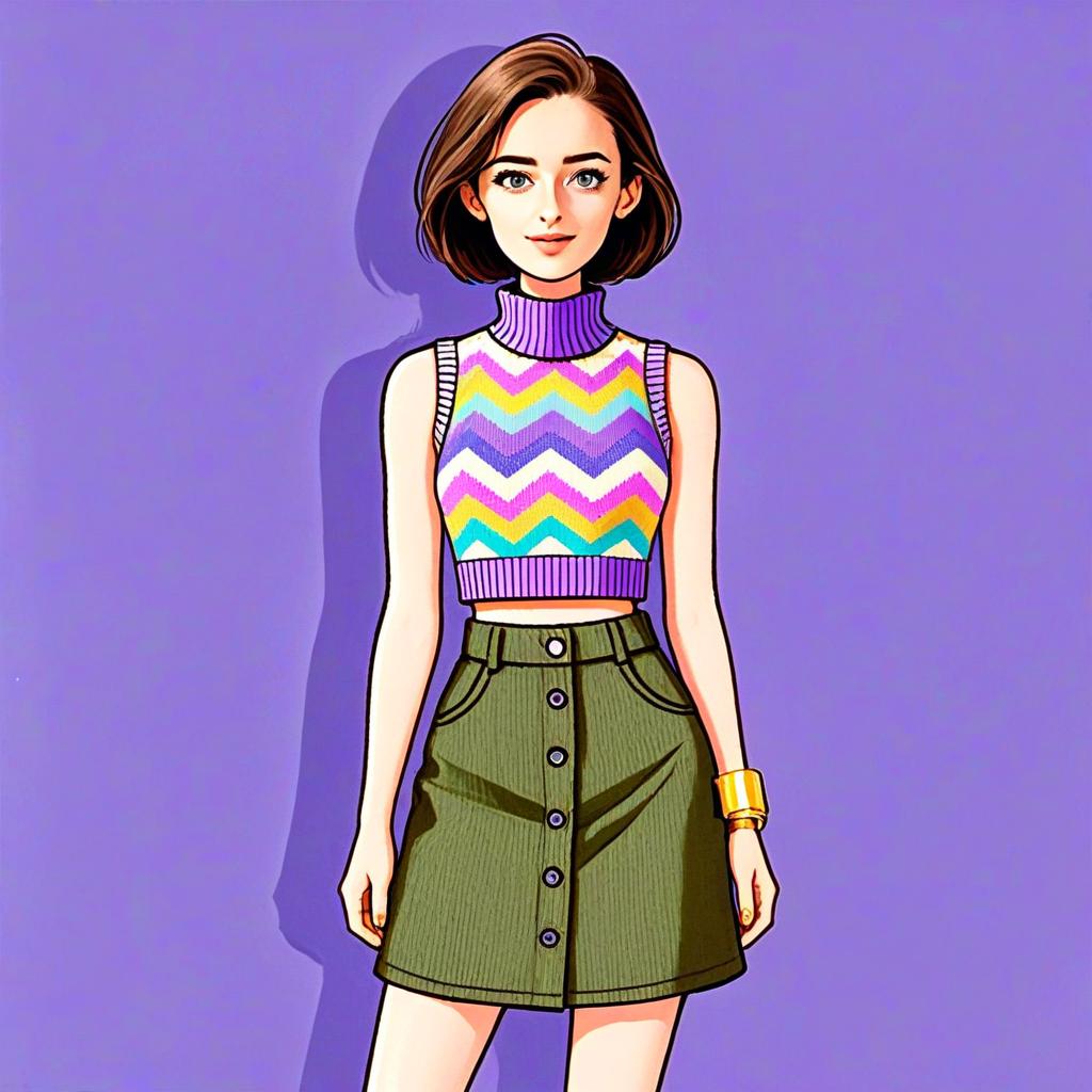 This stylish illustration features a woman with a pretty face and chic short hair, dressed in a colorful sleeveless zigzag-patterned crop top paired with a high-waisted olive green skirt with buttons. The vibrant purple background and the woman's confident pose emphasize a modern casual fashion style with a touch of retro influence.