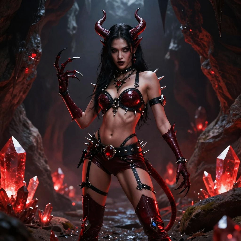A fierce woman dressed in a detailed, dark fantasy demon costume stands confidently in a glowing cavern illuminated by red crystals. Her outfit features spiked leather, red gem embellishments, and curved horns, embodying a powerful and seductive demonic aesthetic with a strong gothic and cosplay style vibe.