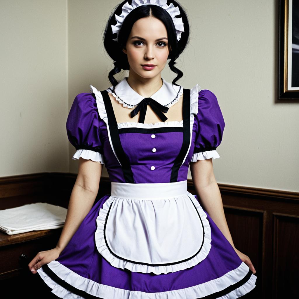 Woman in Purple and White Maid Costume with Black Trimming
