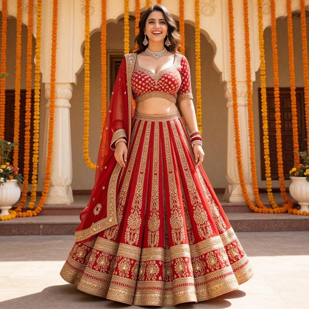 A joyful woman dressed in a traditional red and gold embroidered Indian lehenga poses confidently in front of a decorated architectural backdrop with marigold garlands. The vibrant outfit features intricate golden floral patterns, paired with matching jewelry and bangles, embodying festive elegance.