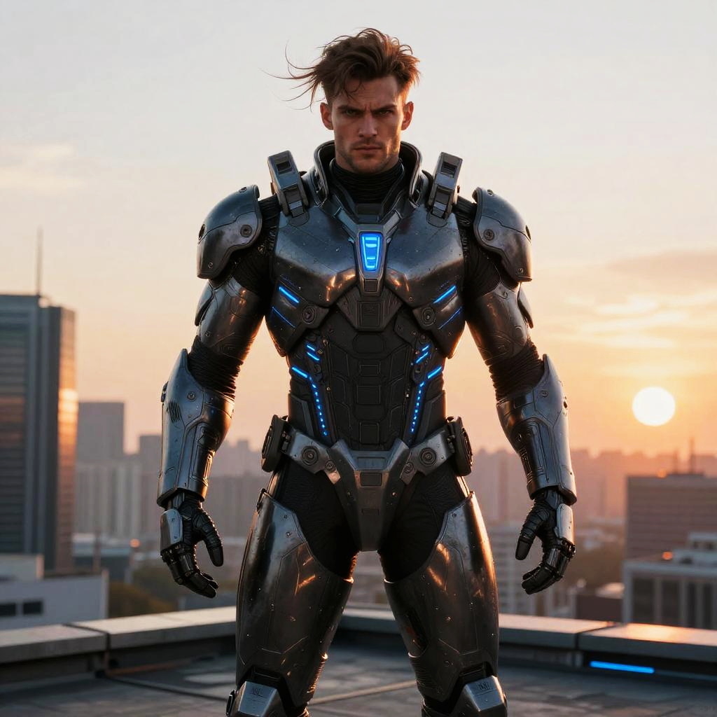 A man stands confidently on a rooftop at sunset wearing a futuristic, high-tech exoskeleton battle suit illuminated with blue LED lights. His intense expression and detailed sci-fi armor evoke a strong, heroic presence in a modern urban skyline setting.