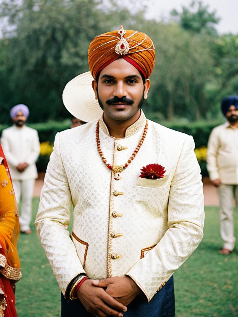 Hindu Wedding Attire Groom in Traditional Sherwani and Turban Outdoors