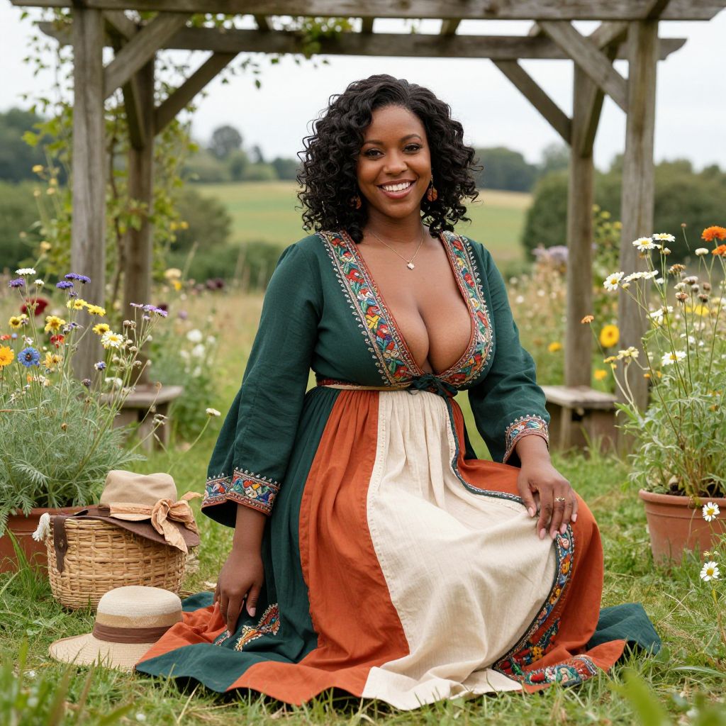 A joyful woman with curly hair sits gracefully in a rustic garden setting surrounded by blooming wildflowers. She wears a colorful bohemian-style dress with intricate embroidery, blending rich green, orange, and cream hues, evoking a natural and peaceful countryside vibe.