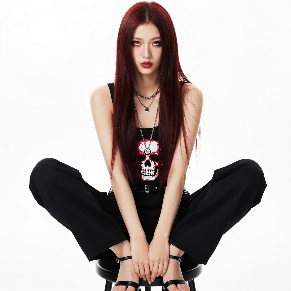 A young woman with long, straight red hair sits cross-legged on a stool against a plain white background. She wears a black tank top featuring a bold red and white skull graphic, paired with black wide-legged pants and black strappy heels, accessorized with layered silver necklaces. The image exudes a modern edgy style with a minimalist composition highlighting her intense gaze and contrasting outfit.
