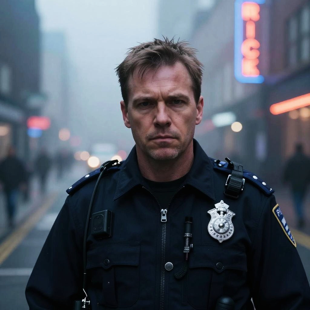 A serious male police officer stands in the middle of a foggy urban street, conveying a sense of determination and focus. The image captures a cinematic, moody atmosphere with blurred city lights in the background, emphasizing the officer’s intense expression and authoritative presence.