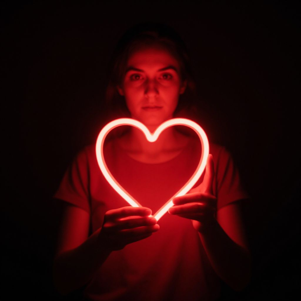 A woman stands against a dark background holding a glowing red neon heart-shaped light close to her chest. The dramatic lighting emphasizes the vibrant glow and creates a striking contrast with the surrounding darkness, evoking themes of love and emotion.