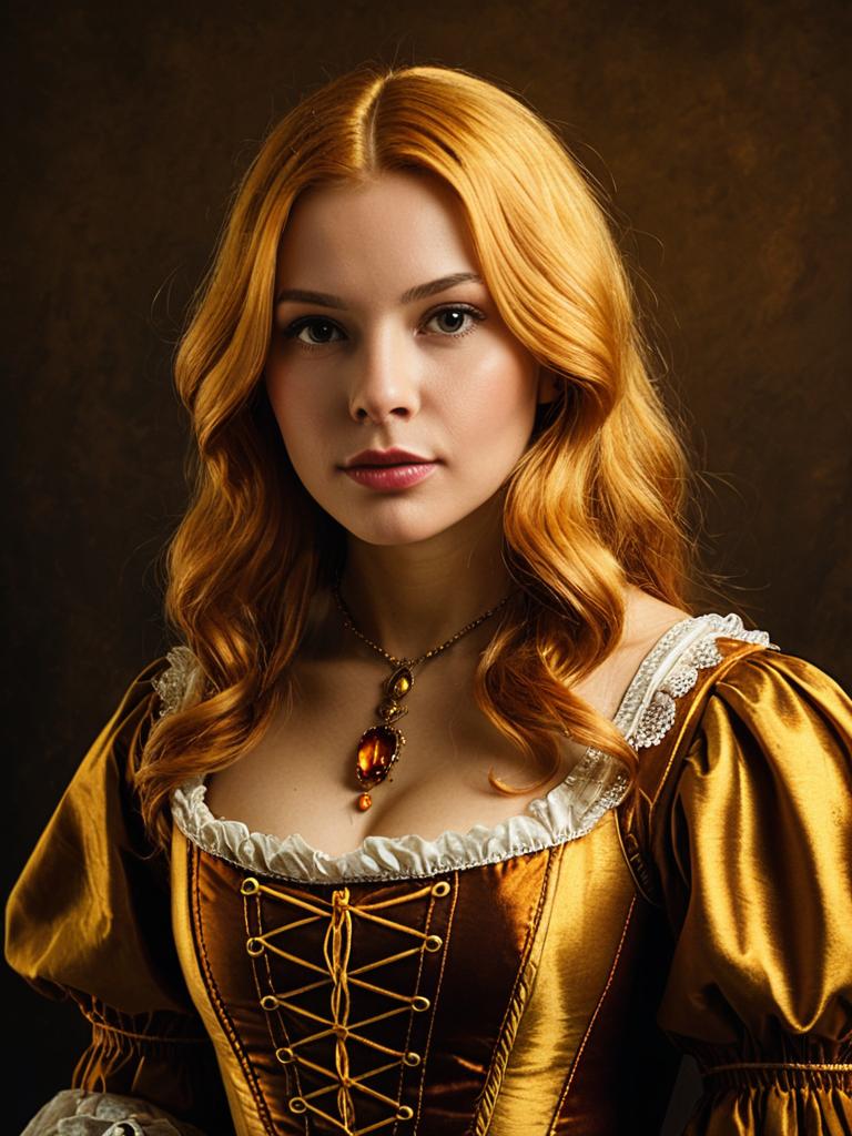 A striking woman dressed in a detailed cosplay costume inspired by a classic Renaissance style. Her golden hair and amber pendant complement the rich, satin-like fabric of her elaborate dress, creating an elegant and timeless look. The portrait features warm lighting and a textured brown background, enhancing the vintage aesthetic.