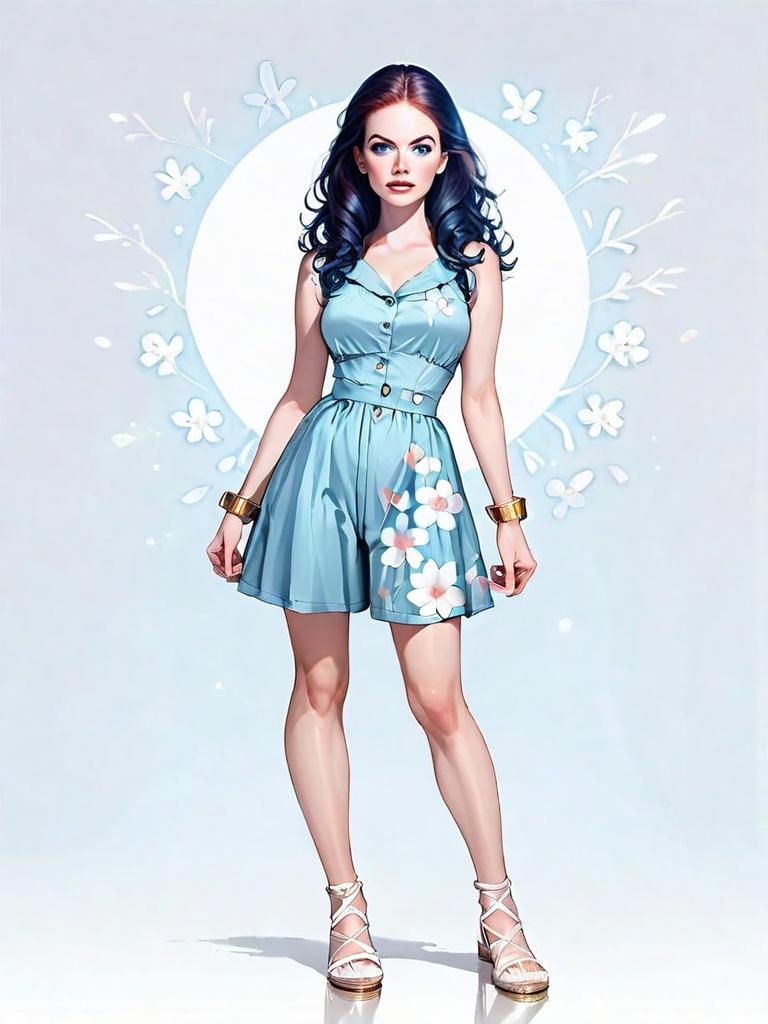This digital artwork features a confident woman standing in a full-body pose, wearing a light blue summer dress adorned with white floral patterns. The illustration blends realistic facial features with a stylized comic art style, enhanced by soft pastel colors and delicate floral accents surrounding her.