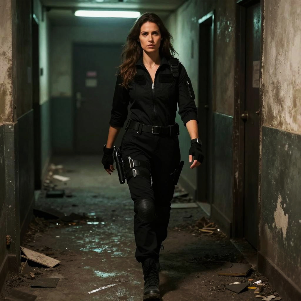 A determined woman dressed in tactical black gear walks confidently through a dimly lit, rundown corridor. The gritty setting and her focused expression evoke a strong action or espionage thriller vibe.