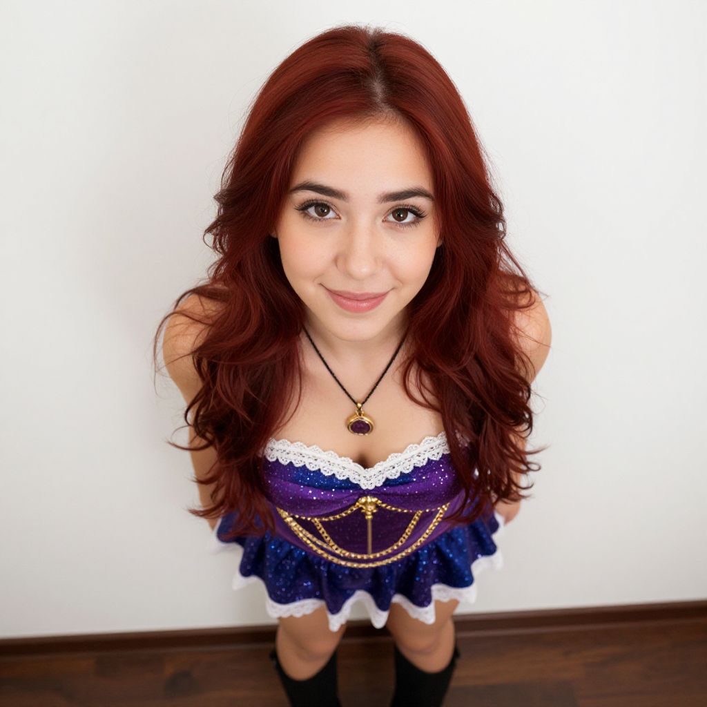 A young woman with long red hair stands against a plain white background, looking up at the camera with a gentle smile. She is wearing a sparkly blue dress adorned with white lace and golden details, complemented by a pendant necklace and black boots. The image highlights a vibrant, cheerful atmosphere with a modern portrait style from a high angle perspective.