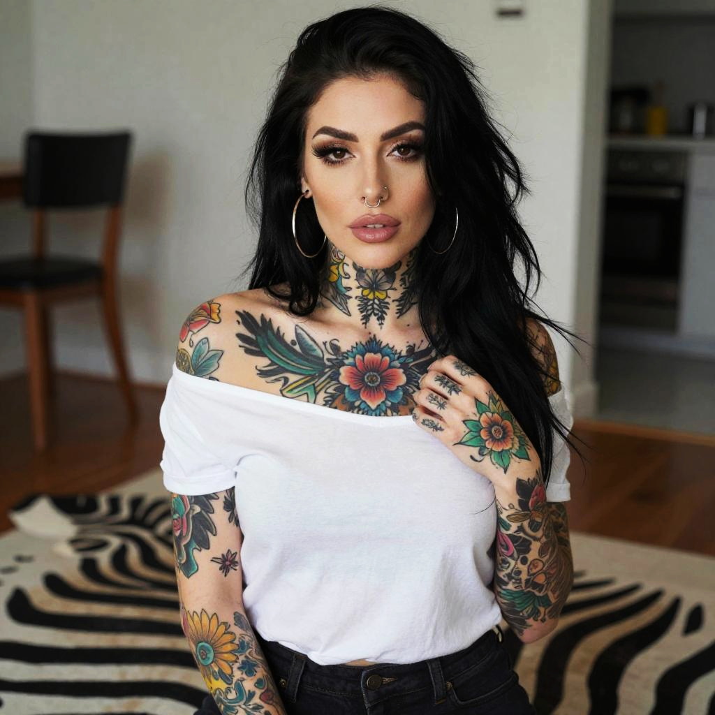 A confident woman with long black hair and numerous colorful floral tattoos covering her arms, chest, and neck poses indoors wearing a white off-shoulder top and black jeans. She accessorizes with large hoop earrings and a septum piercing, looking directly at the camera with a calm yet intense expression in a modern, minimalist living space.