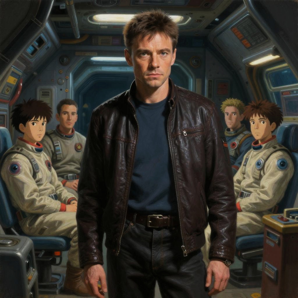 A man in a brown leather jacket stands confidently at the forefront of a futuristic spacecraft interior, surrounded by four astronauts dressed in white space suits. The image combines realistic human portrayal with anime-style characters, blending live-action and animation aesthetics to create a unique sci-fi atmosphere.