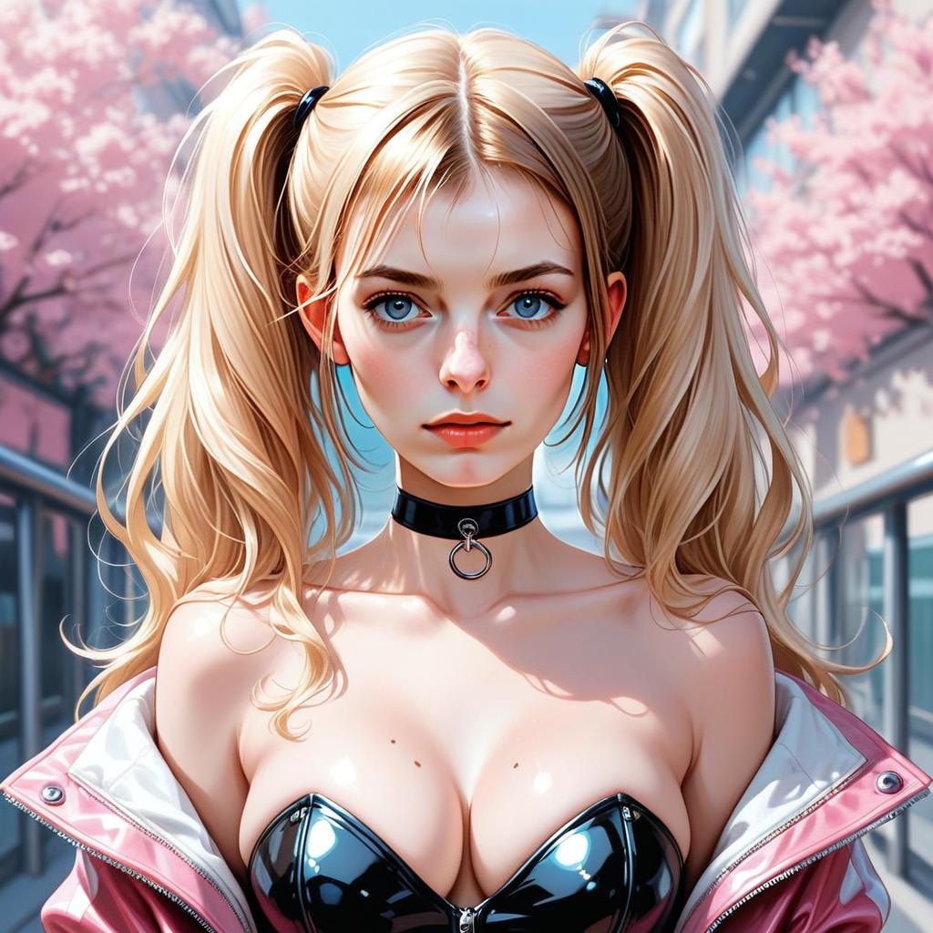 This vibrant digital illustration features a young woman with blonde twin tails wearing a shiny black choker and a glossy black bustier, set against a backdrop of cherry blossom trees in full bloom. The artwork showcases a realistic yet stylized anime-inspired aesthetic with soft lighting and meticulous detail on facial features and textures.