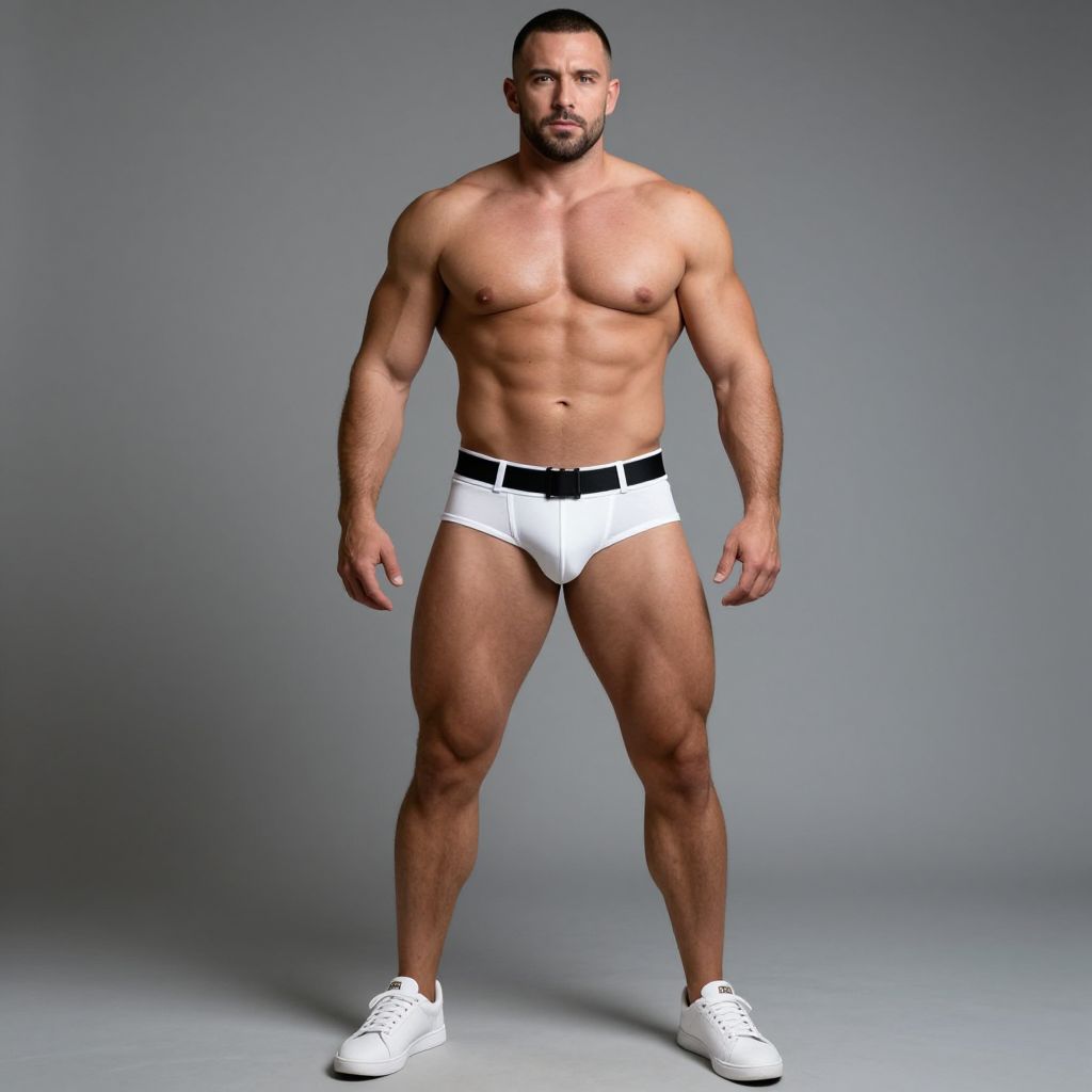 A muscular man stands confidently against a plain gray background, showcasing his toned physique in white briefs with a black belt detail and white sneakers. The image highlights fitness and body strength with a minimalist studio style and soft lighting that emphasizes muscle definition.