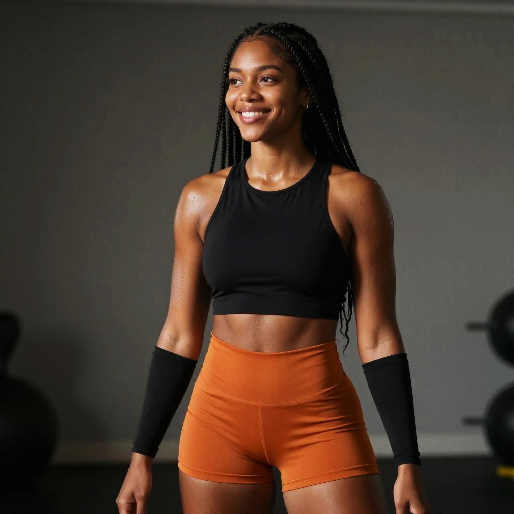 A fit young woman with long braided hair is smiling confidently while wearing a black crop top and orange high-waisted workout shorts. The image highlights her athletic physique and is set in a modern gym environment with muted lighting.