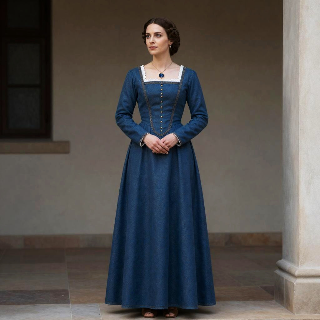 A woman dressed in formal medieval clothing stands poised in a historical building, wearing a long blue dress with button details and a square neckline accented with lace. Her hair is styled in an elegant braided updo, complementing the traditional and refined medieval fashion theme.