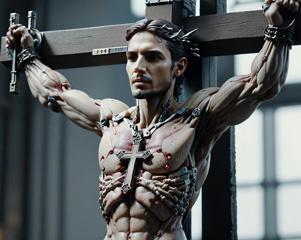 The image displays a detailed white stone male statue with a classic oil paint aesthetic, set against a striking red background adorned with intricate patterns. The statue's back is lined up perfectly, showcasing the artistry involved in the sculpture.