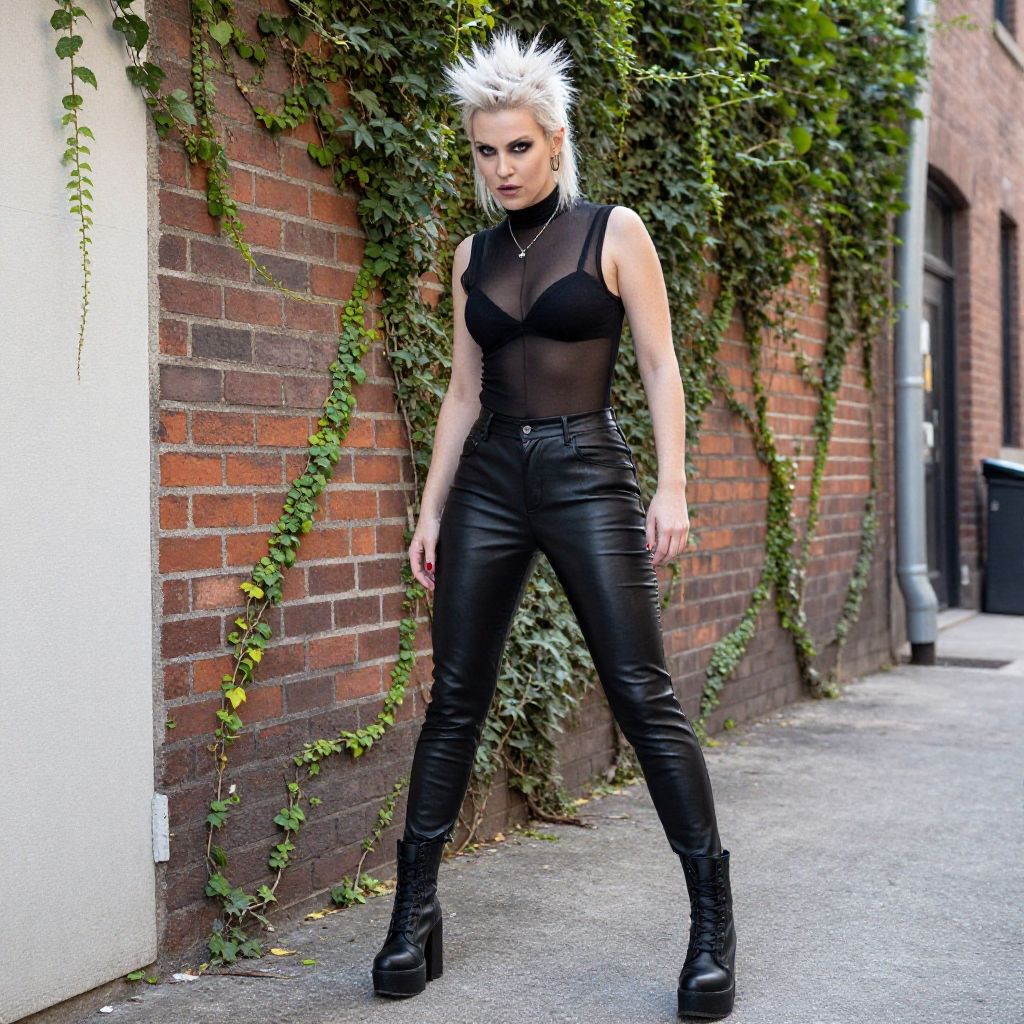 A confident woman with platinum blonde spiked hair poses against a brick wall adorned with trailing ivy. She wears a sheer black top, high-waisted leather pants, and chunky black platform boots, embodying a modern punk rock style in an urban alley setting.