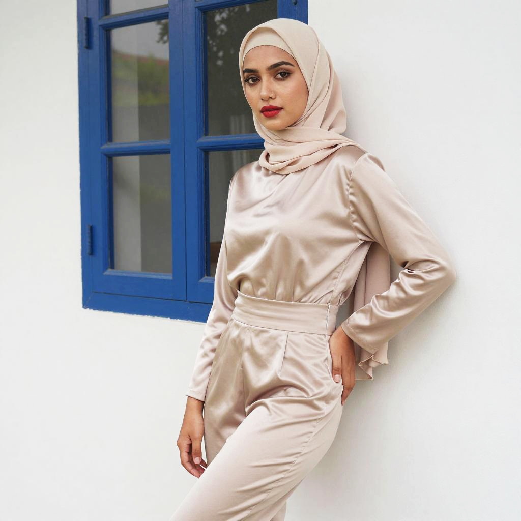 A stylish woman wearing a light beige satin outfit and matching hijab poses gracefully against a white wall with a blue-framed window. The soft sheen of her attire and her confident expression highlight contemporary modest fashion with a sophisticated touch.