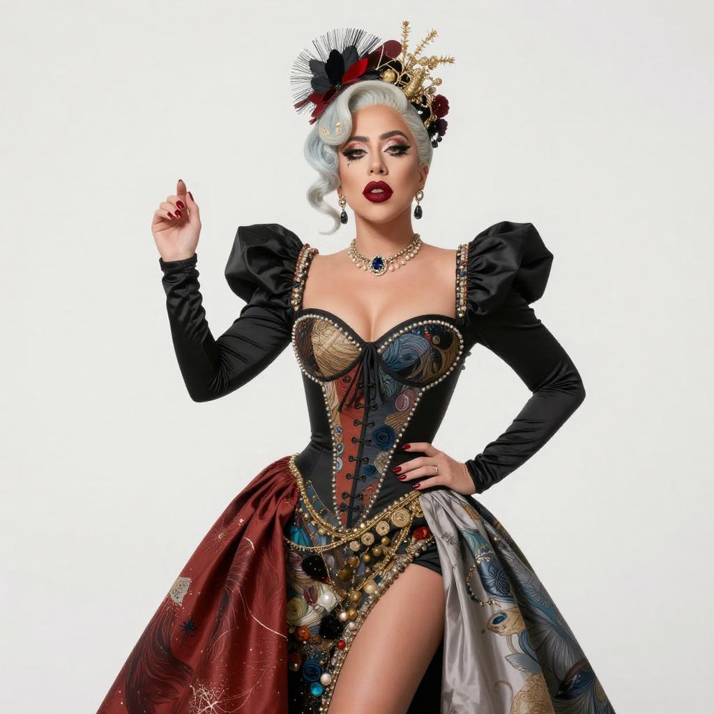 A glamorous woman dressed in an intricate baroque-inspired couture gown showcasing bold puffed sleeves, a detailed corset, and a high slit skirt with rich patterns and embellishments. Her vintage hairstyle, dramatic makeup, and ornate headpiece complete the striking, theatrical look, embodying a luxurious, high-fashion aesthetic.