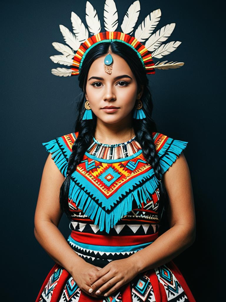 A woman dressed in a vibrant and intricately patterned Aztec princess costume stands confidently against a dark background. She wears a colorful headdress adorned with white feathers and matching jewelry, capturing the photorealistic and detailed essence of Aztec-inspired cosplay in a studio setting.