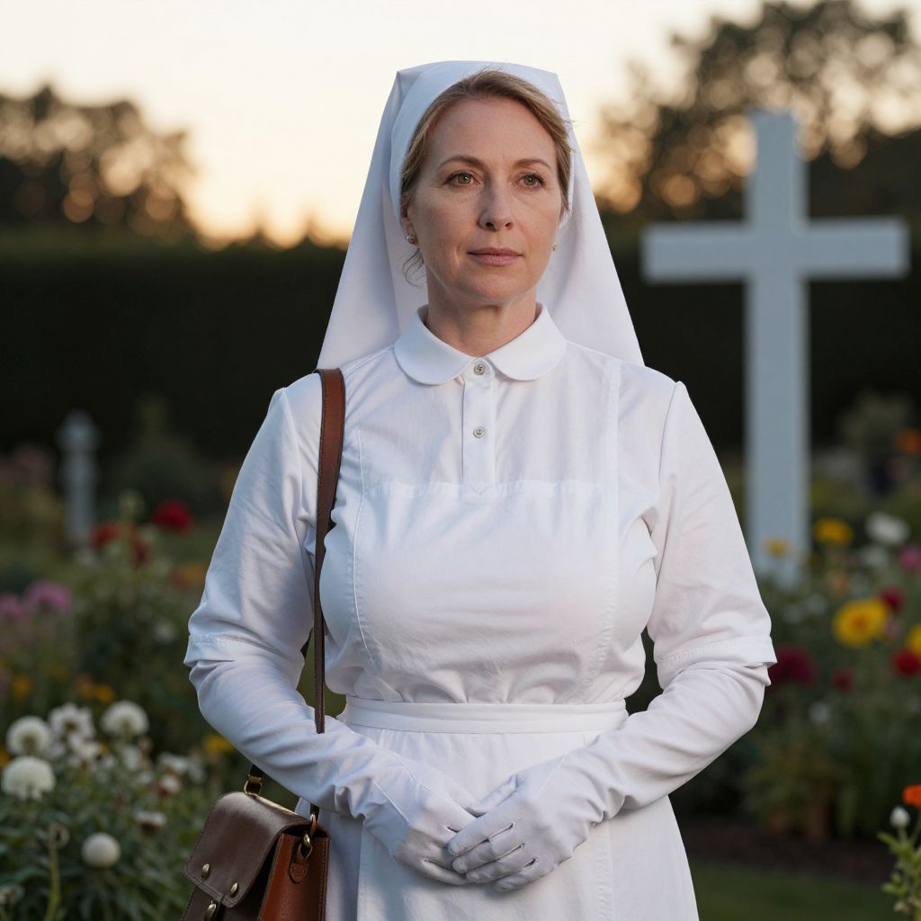 A woman dressed in a traditional white nurse uniform stands solemnly in a cemetery with a large white cross in the background. The soft lighting of the setting sun adds a peaceful yet reflective atmosphere to the scene.
