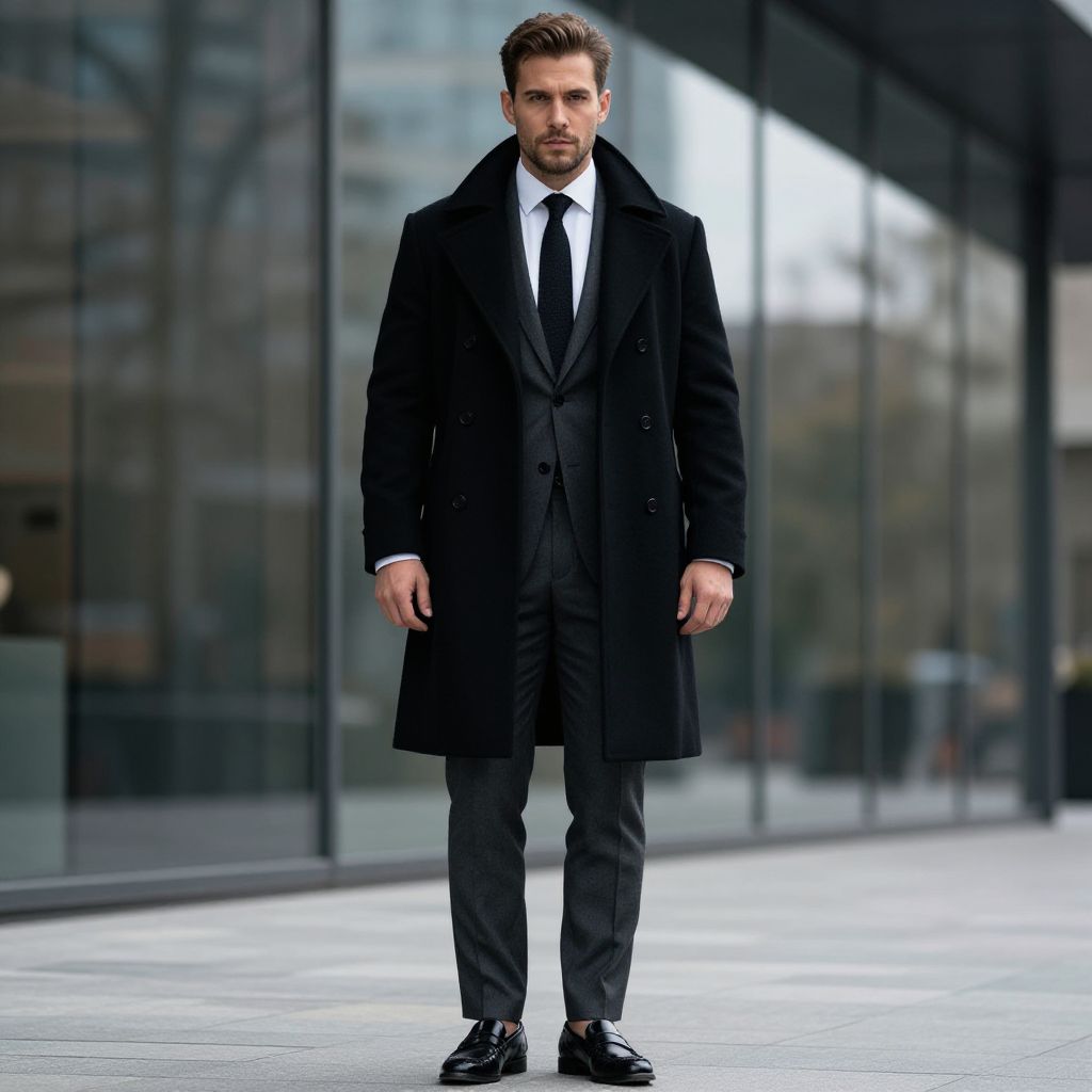 A well-dressed man stands confidently in front of a modern glass building, wearing a sharp black overcoat over a tailored dark gray suit and black tie. His polished black shoes and neatly groomed hair complement the sophisticated urban style, perfectly capturing contemporary men's business fashion.