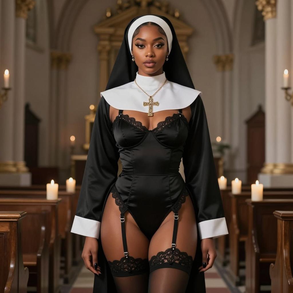A confident woman dressed in a provocative black and white nun-inspired lingerie outfit stands in the aisle of a candlelit church. The image blends religious symbolism with contemporary fashion, highlighting contrast and boldness in its composition.