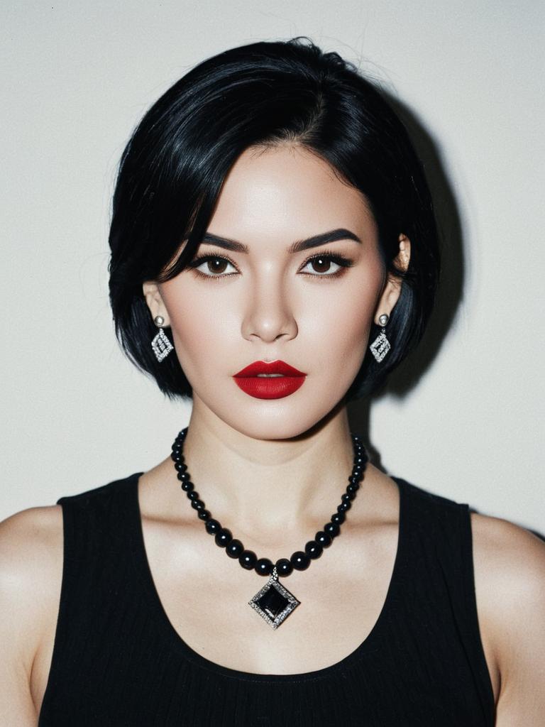 Elegant Woman with Black Bob Hairstyle and Red Lipstick Wearing Jewelry