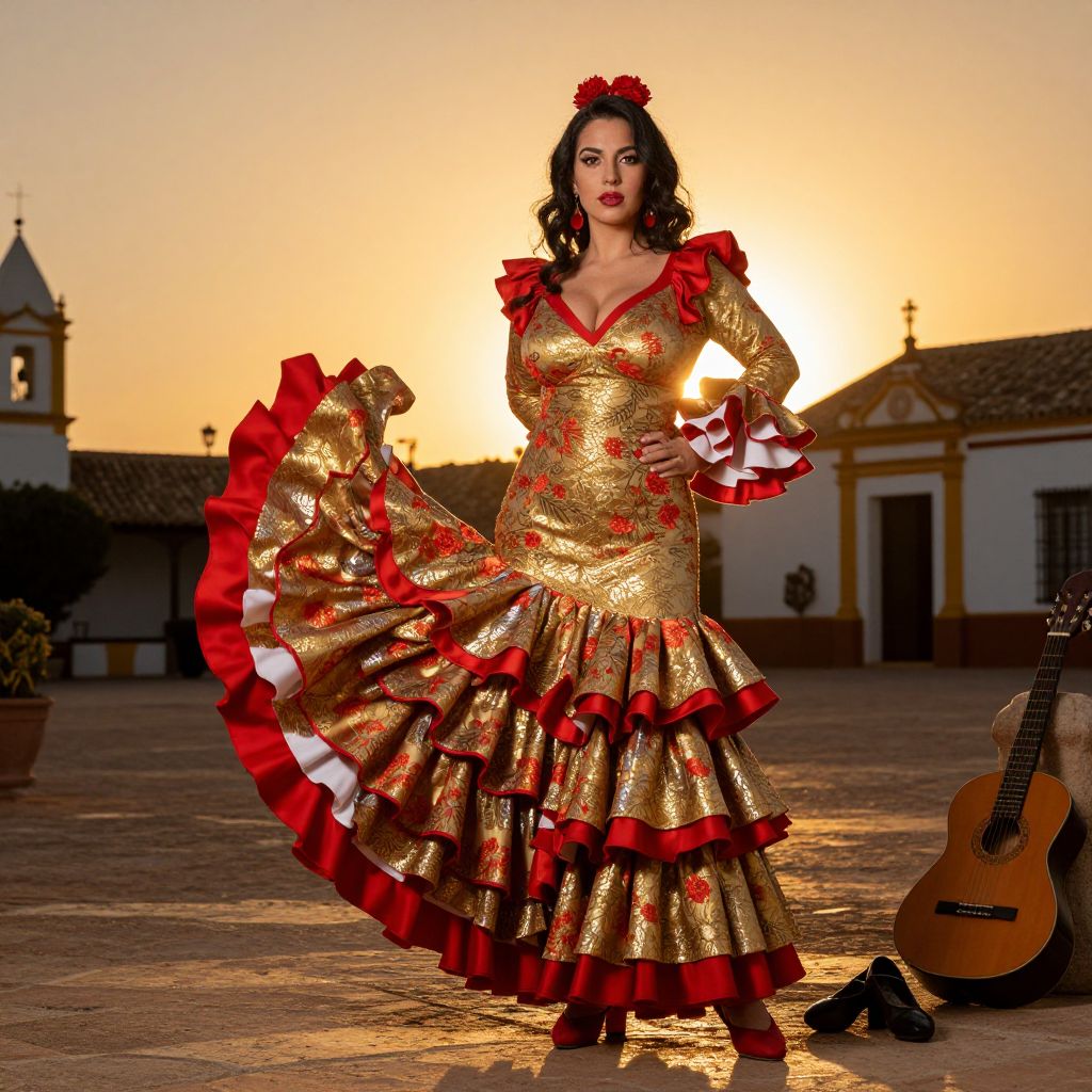 Traditional Spanish Flamenco Dancer in Gold and Red Dress at Sunset