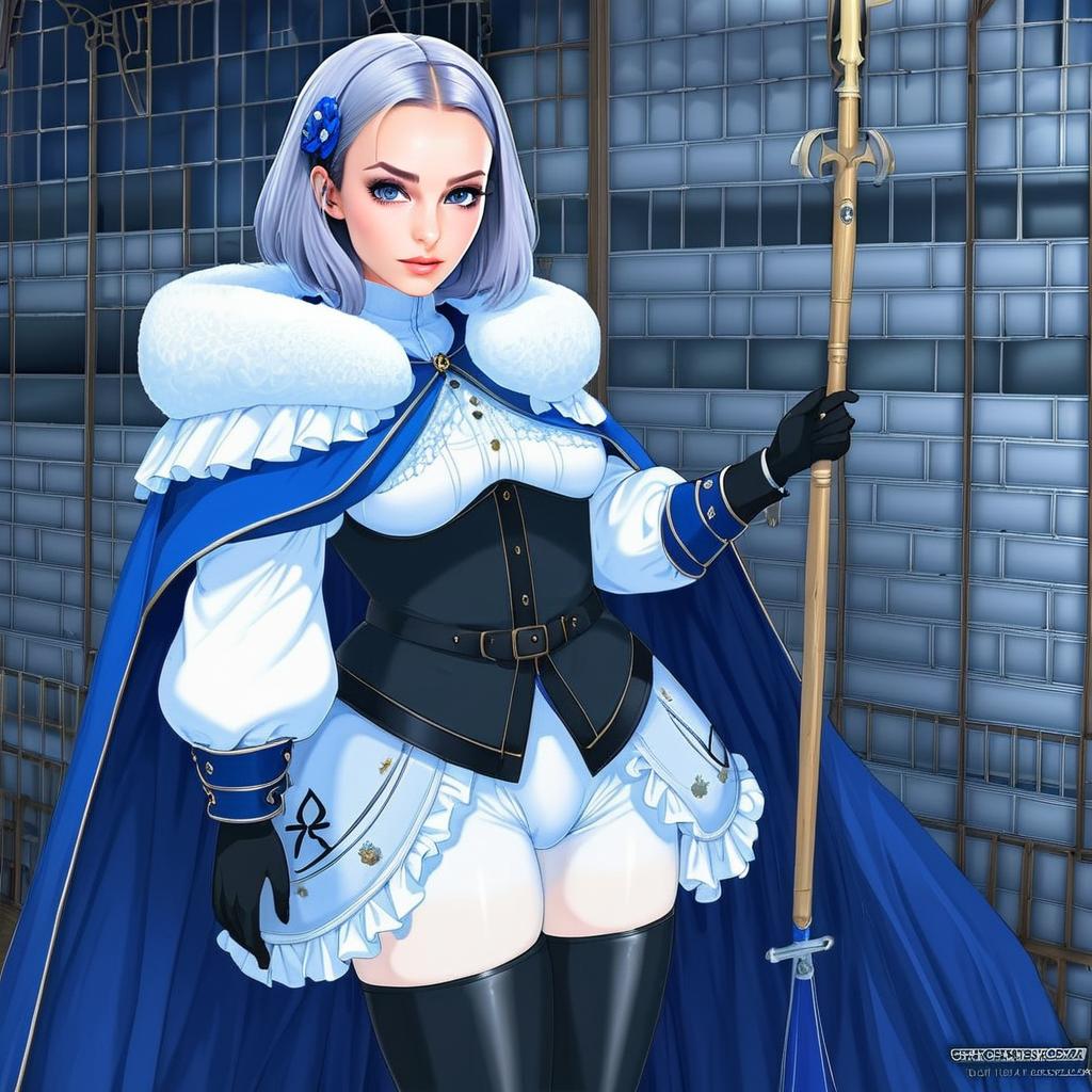 This anime-style illustration depicts a confident woman dressed in a detailed blue and white medieval-inspired outfit, complete with a fur-trimmed cape and black gloves. She holds a long golden staff with an ornate top, standing against a backdrop of a blue-tiled wall, blending fantasy and historical fortress themes.