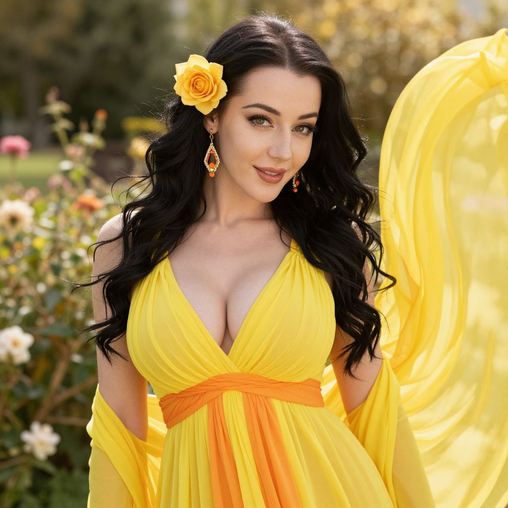 A beautiful woman with long black hair styled in soft waves poses outdoors wearing a flowing yellow and orange dress. She has a yellow rose tucked behind her ear and matching orange earrings, standing against a blurred floral background that complements the vibrant color of her outfit.