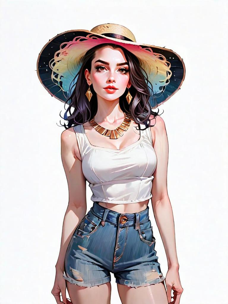 This artwork features a stylish woman depicted in a realistic comic style, wearing a wide-brimmed, bohemian hat with gradient hues. She is dressed in a white crop top and high-waisted distressed denim shorts, accessorized with geometric earrings and a bold gold necklace, embodying modern bohemian fashion.