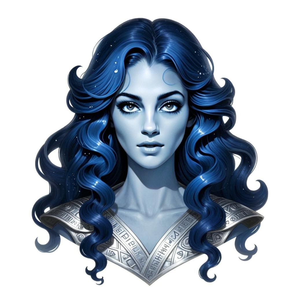 A striking digital portrait of a woman with flowing, deep blue hair and pale blue skin, adorned in an intricately detailed metallic armor collar engraved with ancient symbols. The artwork showcases a fantasy style with a serene yet powerful expression, blending realism and stylized elements in vivid detail.