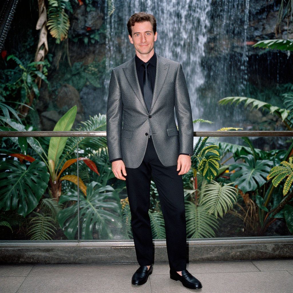 A man stands confidently in front of a lush backdrop featuring tropical plants and a cascading waterfall. He is dressed in a sleek, modern suit jacket with a black shirt and trousers, combining formal elegance with a natural, serene environment.