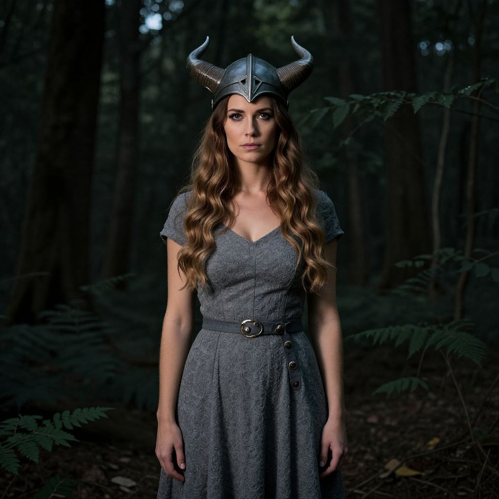 A woman stands confidently in a dark forest setting, wearing a textured gray dress and a distinctive Viking-style helmet with large horns. The image combines elements of fantasy and historical cosplay, highlighted by the moody, natural lighting that enhances the mysterious atmosphere.