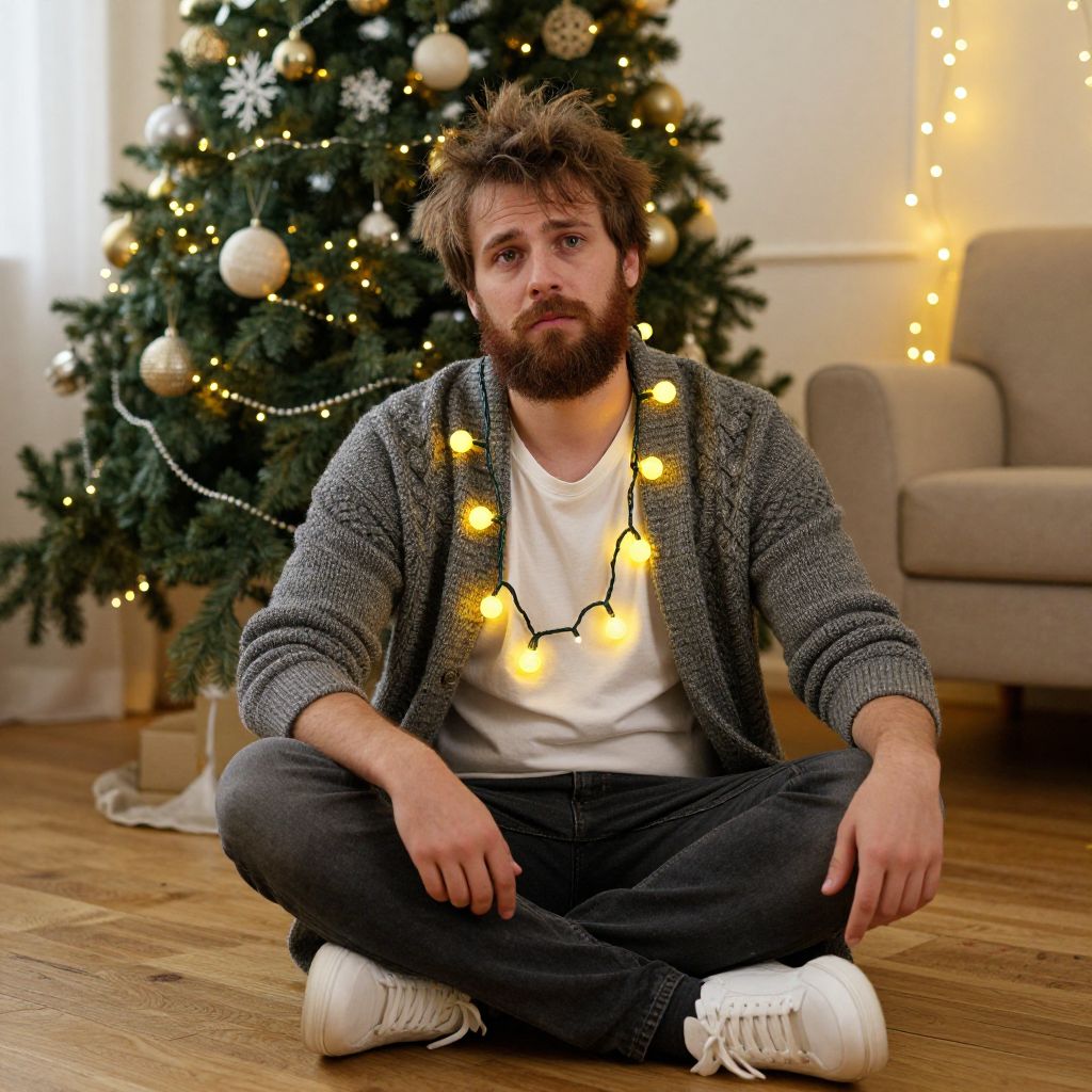 A disheveled man with a beard sits cross-legged on a wooden floor in front of a decorated Christmas tree, wearing a gray cardigan, white t-shirt, and jeans. He has a string of glowing yellow Christmas lights draped around his neck, conveying a tired or contemplative holiday mood. The cozy living room setting includes warm lighting and festive decor, creating an intimate seasonal atmosphere.