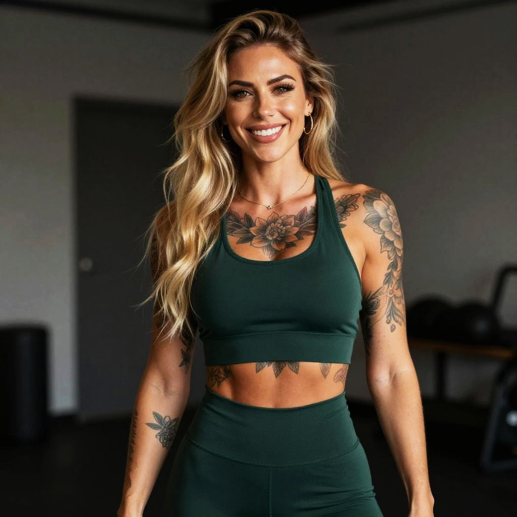 A fit woman with long blonde hair and floral tattoos smiles confidently in a dark green sports bra and matching leggings, standing in a gym setting. This high-quality portrait highlights her athletic physique and vibrant personality in a modern fitness environment.