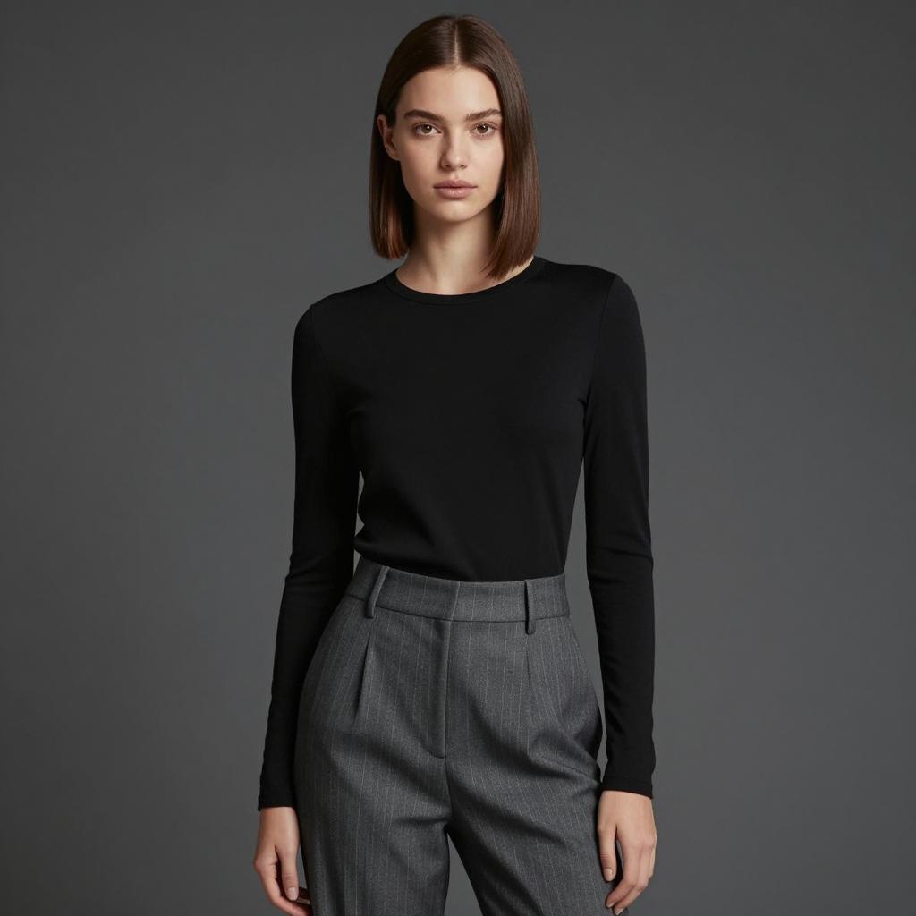 A young woman with straight, shoulder-length brown hair stands confidently against a dark gray background. She is dressed in a minimalist, modern outfit featuring a black long-sleeve top and high-waisted gray pinstripe trousers, embodying a clean and sophisticated style suitable for Gen Z fashion trends.