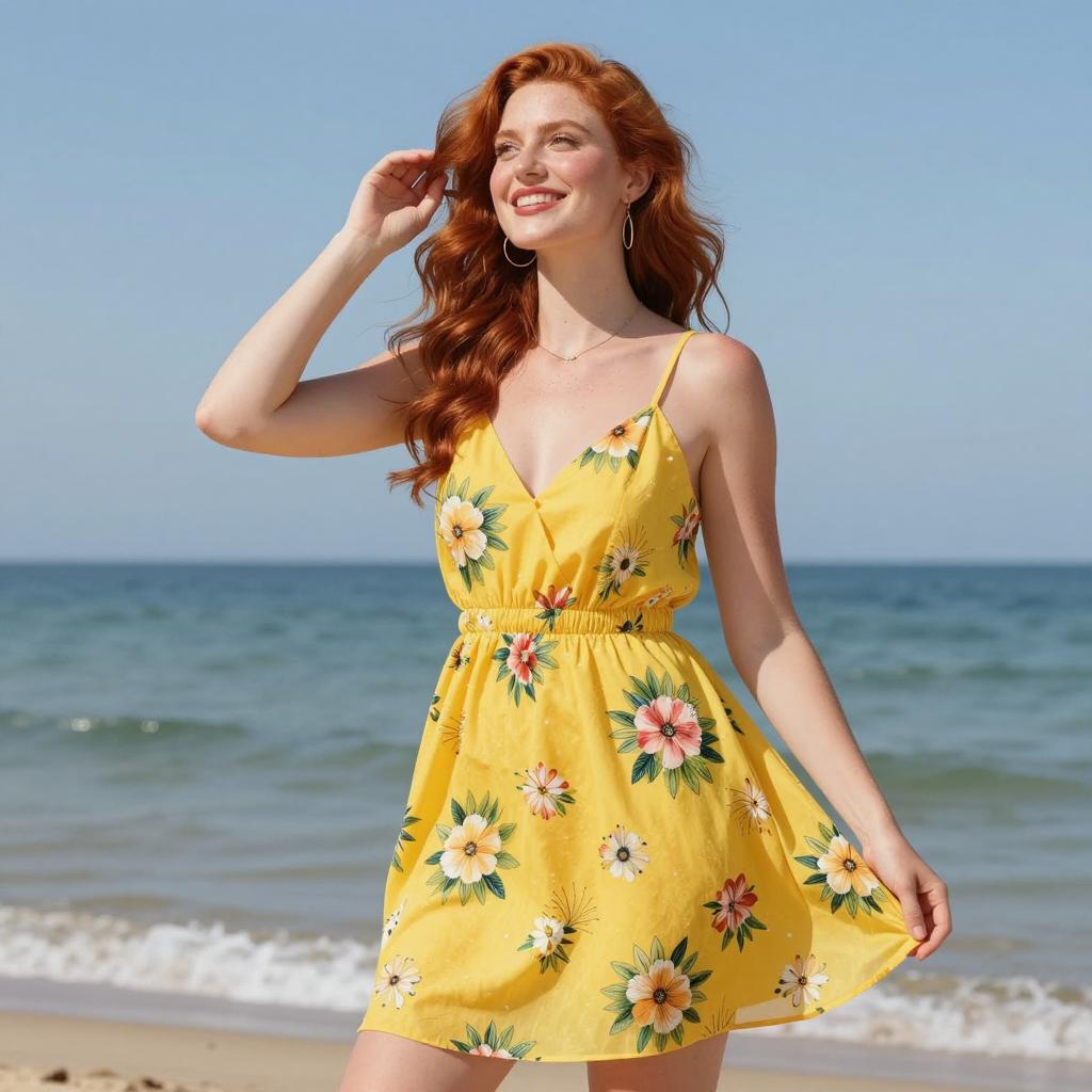 A cheerful young woman with flowing red hair is enjoying a sunny day at the beach, wearing a vibrant yellow sundress adorned with floral prints. The clear blue sky and calm ocean enhance the summery and carefree vibe of the scene.