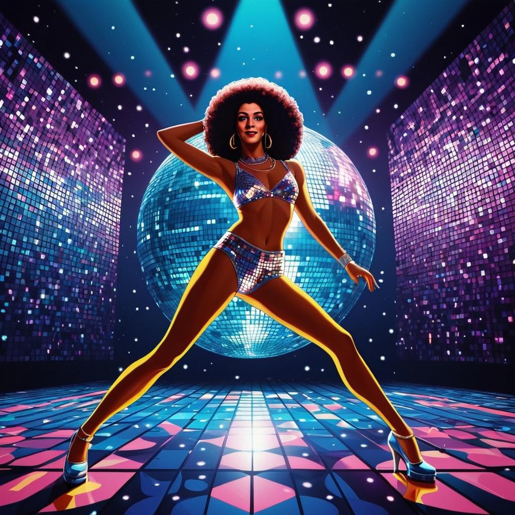 A confident woman with an afro hairstyle poses dynamically on a colorful disco dance floor, surrounded by vibrant purple and blue lights and a large mirrored disco ball. The image captures the essence of 1970s disco culture with reflective clothing and energetic flair in a highly stylized, digital art format.
