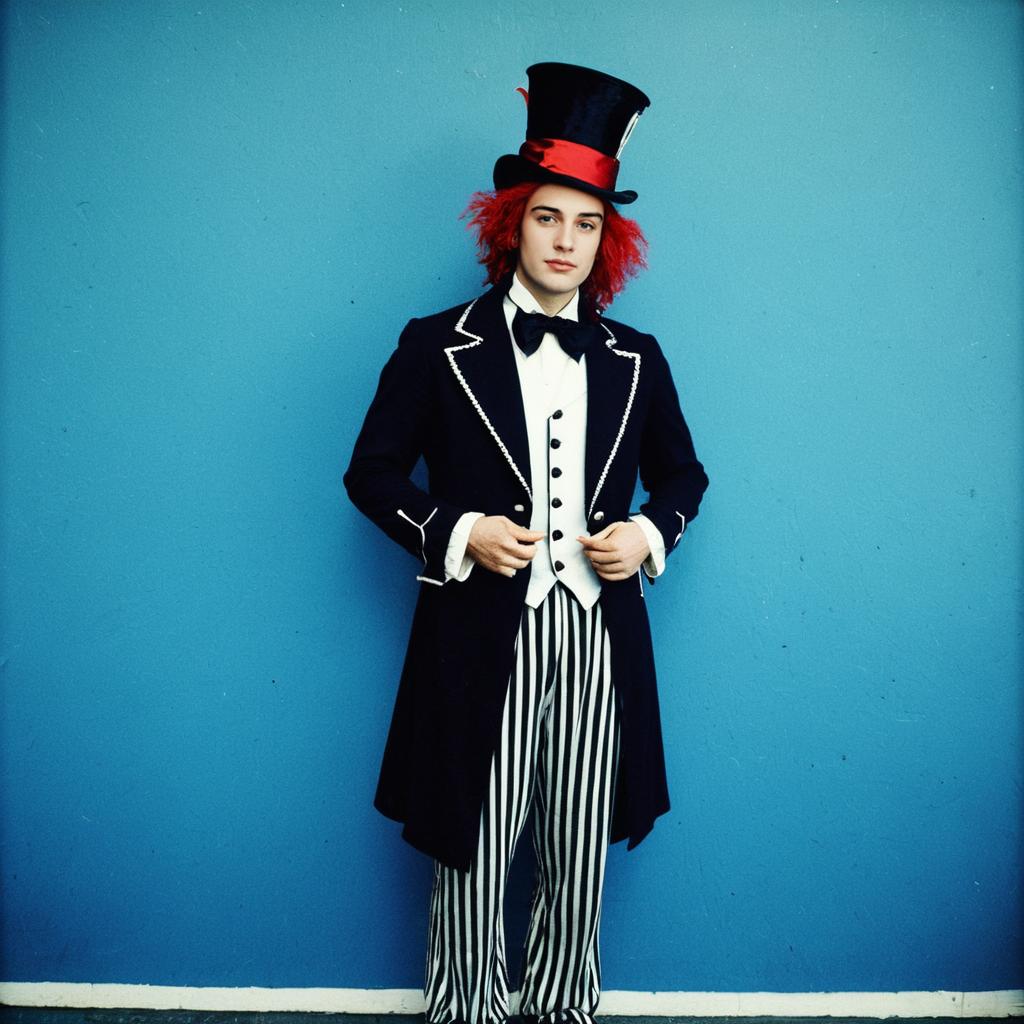 A man dressed in a detailed male Alice in Wonderland costume stands confidently against a blue background. He wears a black top hat with a red band, a long black coat with white trim, a white vest, bow tie, and bold black-and-white striped pants, evoking the whimsical style of the Mad Hatter character.