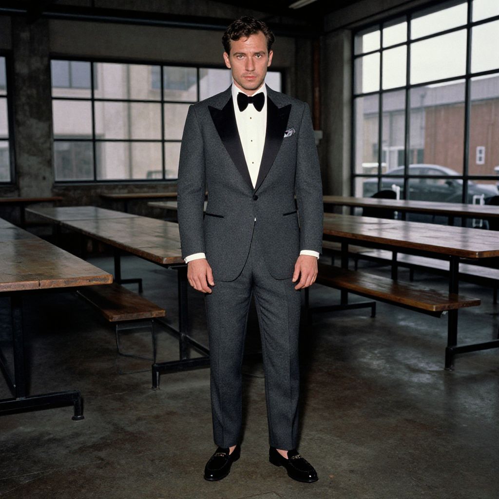 A man dressed in a stylish grey tuxedo with black lapels stands confidently in an industrial-style room featuring large windows and wooden benches. The sharp contrast of his classic bow tie and polished loafers adds a modern twist to the formal attire, set against a rugged, urban backdrop.