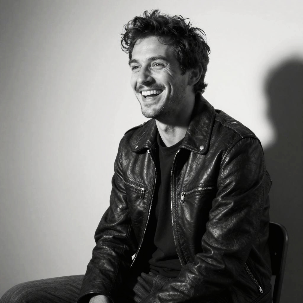 A young man with tousled hair, dressed in a black leather jacket and dark clothing, is captured in a candid moment of laughter against a plain background. The black and white portrait exudes a natural and relaxed vibe, highlighting his joyful expression and casual style.