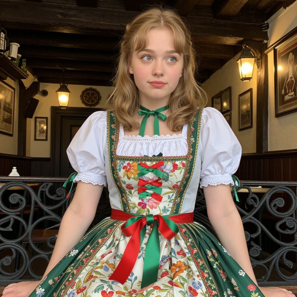 A young woman wearing a traditional Bavarian dirndl dress with vibrant floral patterns and contrasting red and green ribbons is seated indoors in a rustic setting. The wooden beams and warm lighting create a cozy atmosphere that complements her classic folk attire.