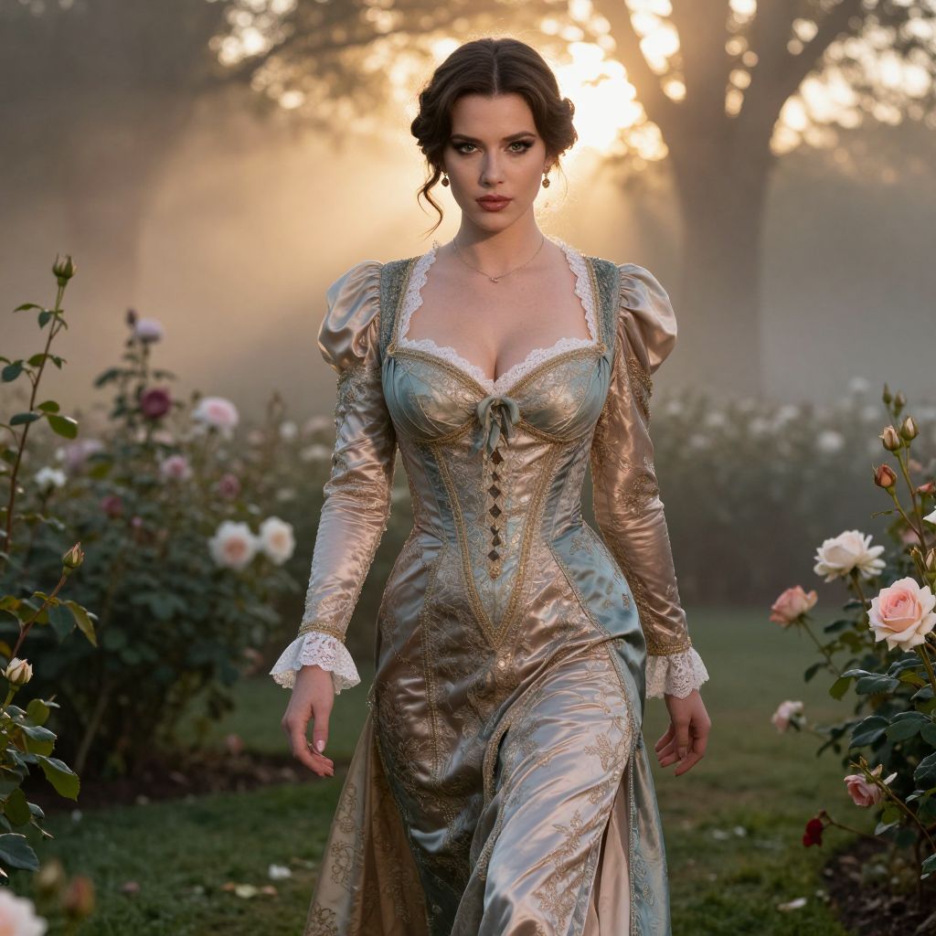 Elegant Woman in Vintage Gown Walking Through Rose Garden at Sunset