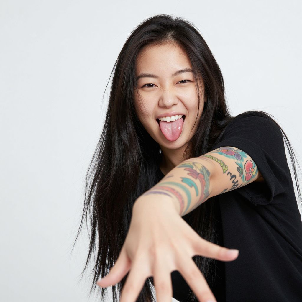 A playful young woman with long black hair and colorful arm tattoos is sticking her tongue out while reaching forward with an open hand. She wears a simple black t-shirt against a plain white background, exuding a fun and carefree attitude.