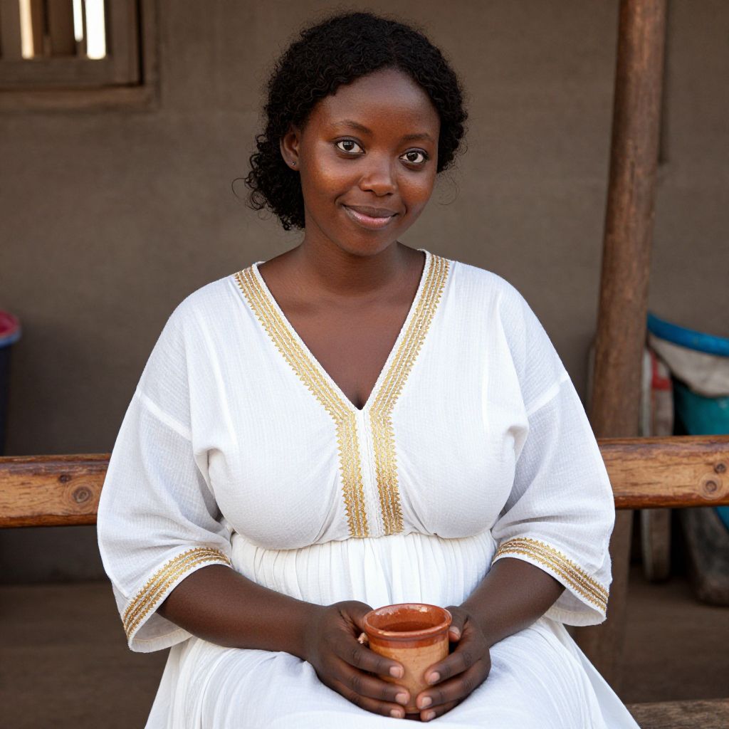A serene young woman dressed in a traditional white dress with gold embroidery sits on a rustic wooden bench holding a small clay cup. The warm smile and relaxed pose capture a moment of peaceful reflection in a simple, earthy setting.