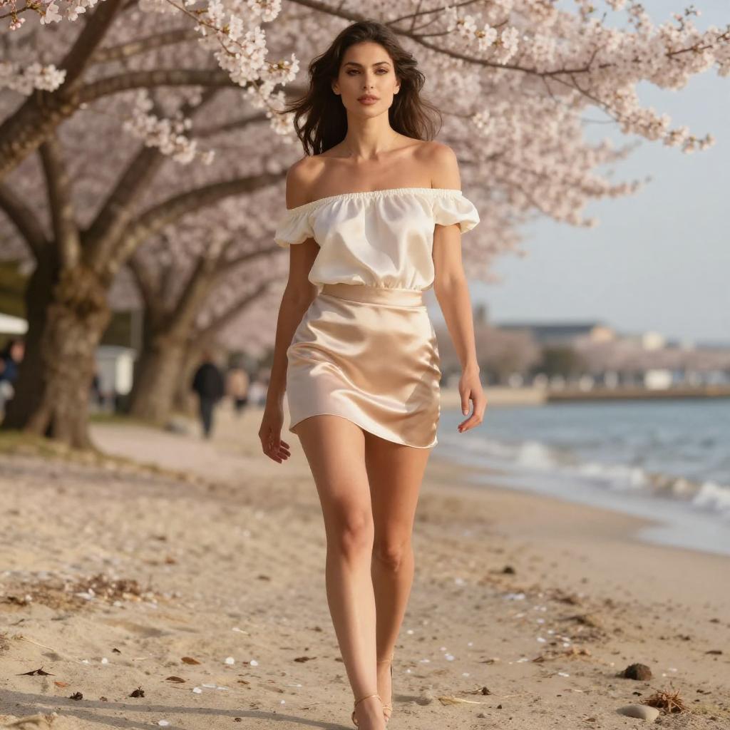 A woman confidently walks along a sandy beach lined with blooming cherry blossom trees, wearing a stylish off-shoulder white top and a satin beige mini skirt. The serene background of water and soft pink blossoms creates an elegant and natural springtime atmosphere, highlighting contemporary fashion in an outdoor setting.